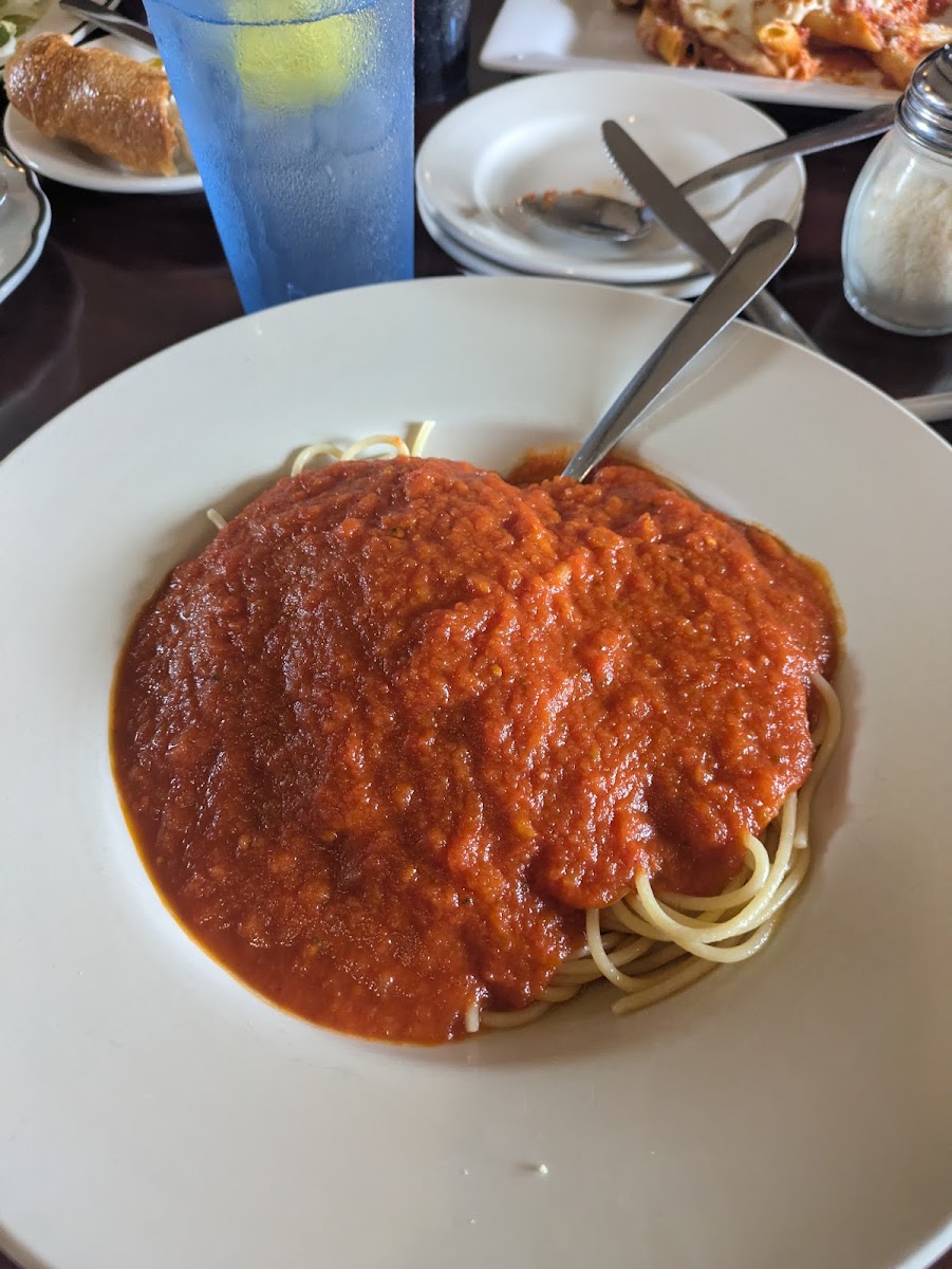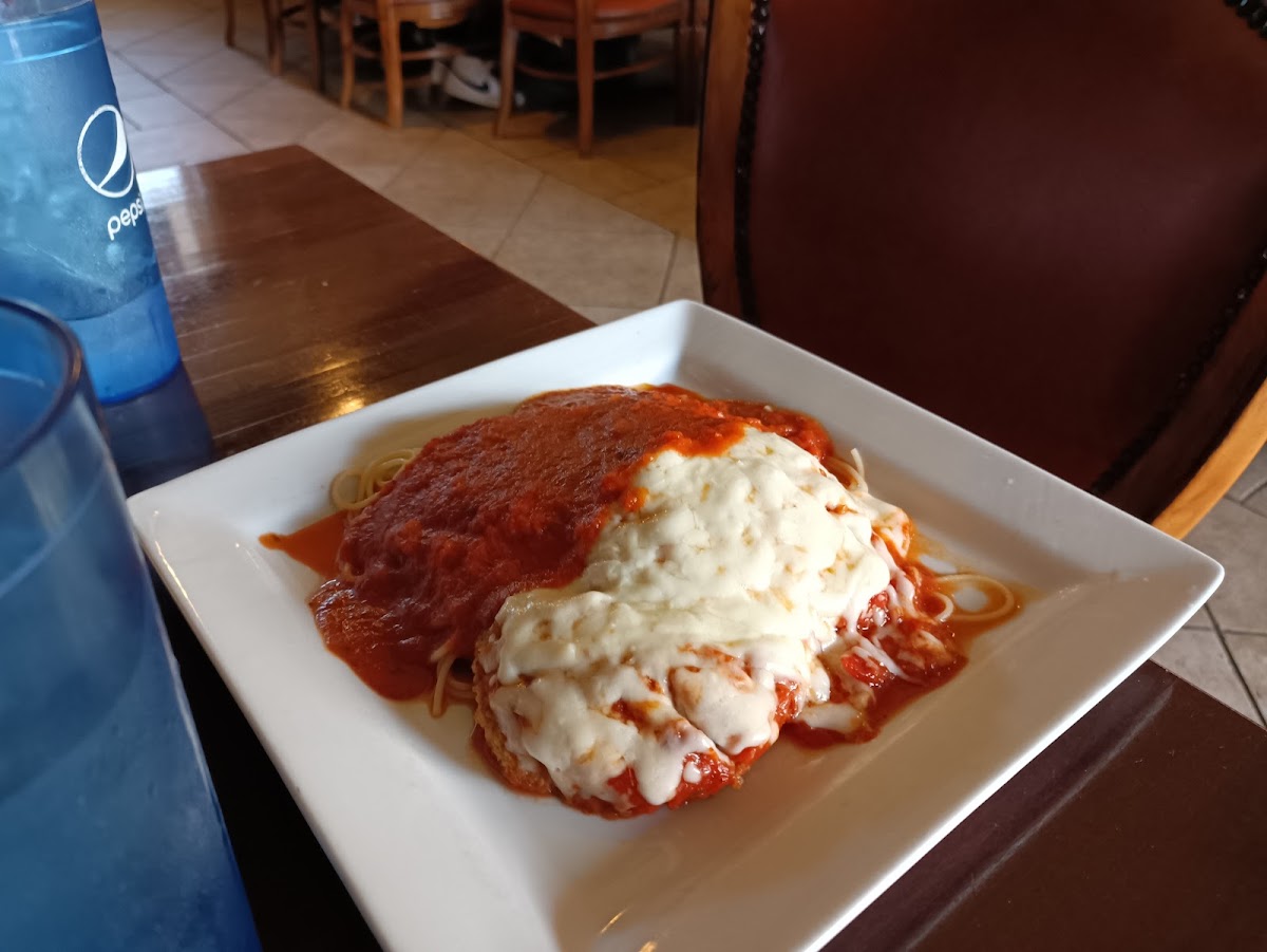 our second weekend in a row visiting Prima Pasta. The bread is good! But the garlic butter is a little salty, might consider using garlic powder instead of garlic salt to make it. I like the fact that they use angel hair pasta on the veal parmigiana and on the piccata but they need to drain the angel hair a little longer as it tends to come out wet. Wonderful Italian cream cake for dessert both times! I didn't last long enough to take a picture of it. ...Oh, and the house vinaigrette is very interesting! We have had the same waitress both times, hello Jayden (sp?), She is new to the restaurant business but is learning quickly!