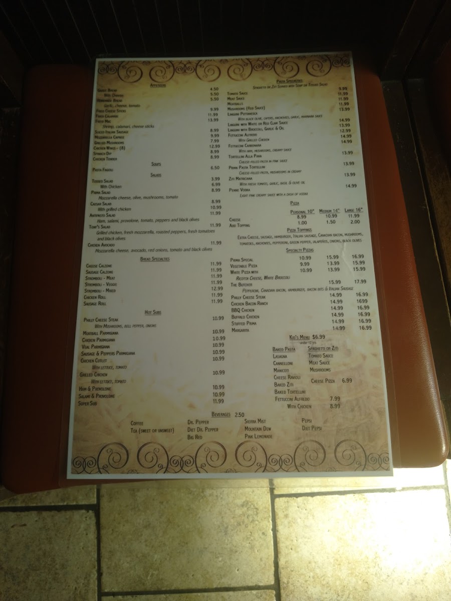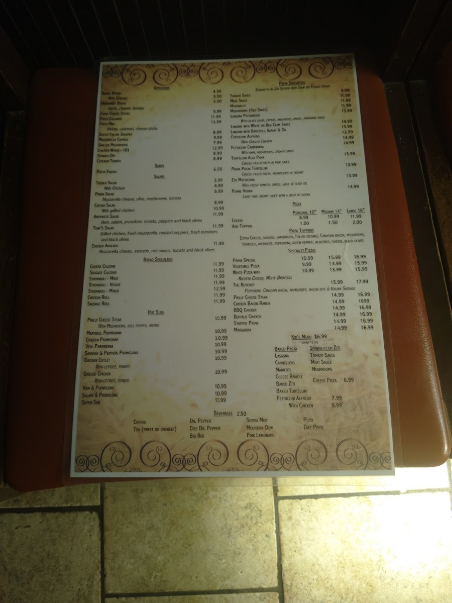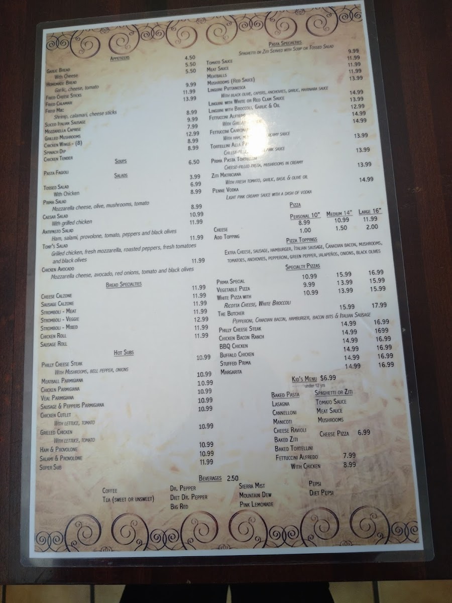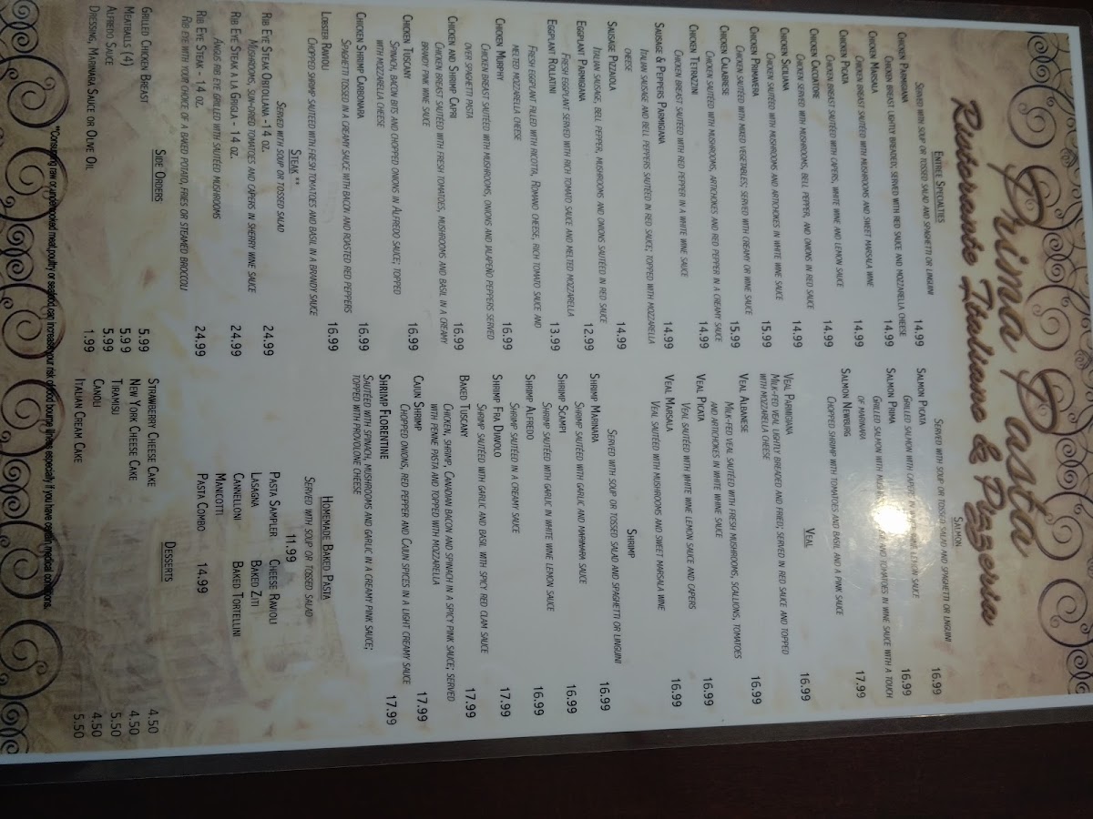 Prima Pasta Menu