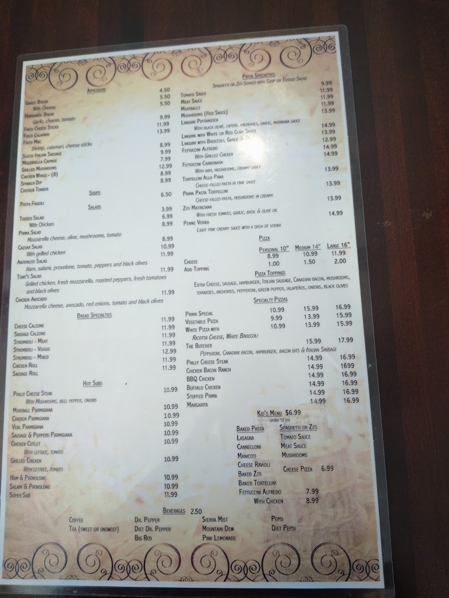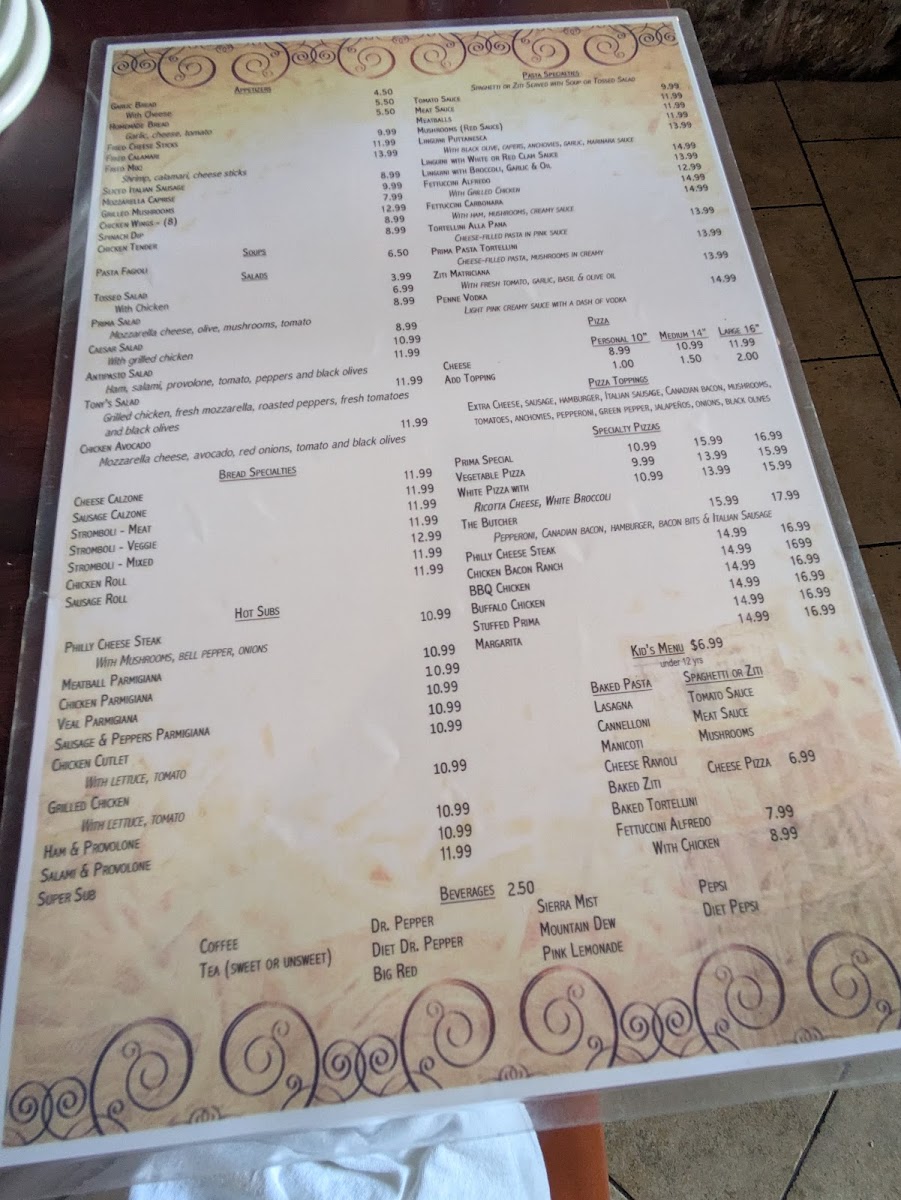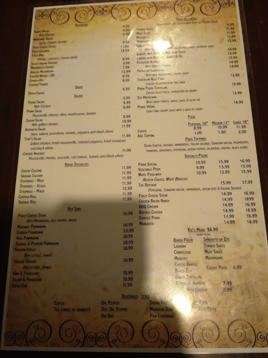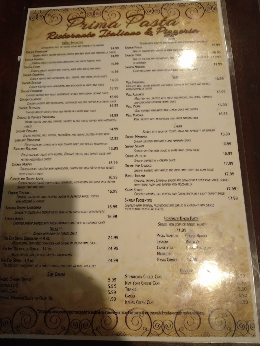 Prima Pasta Menu